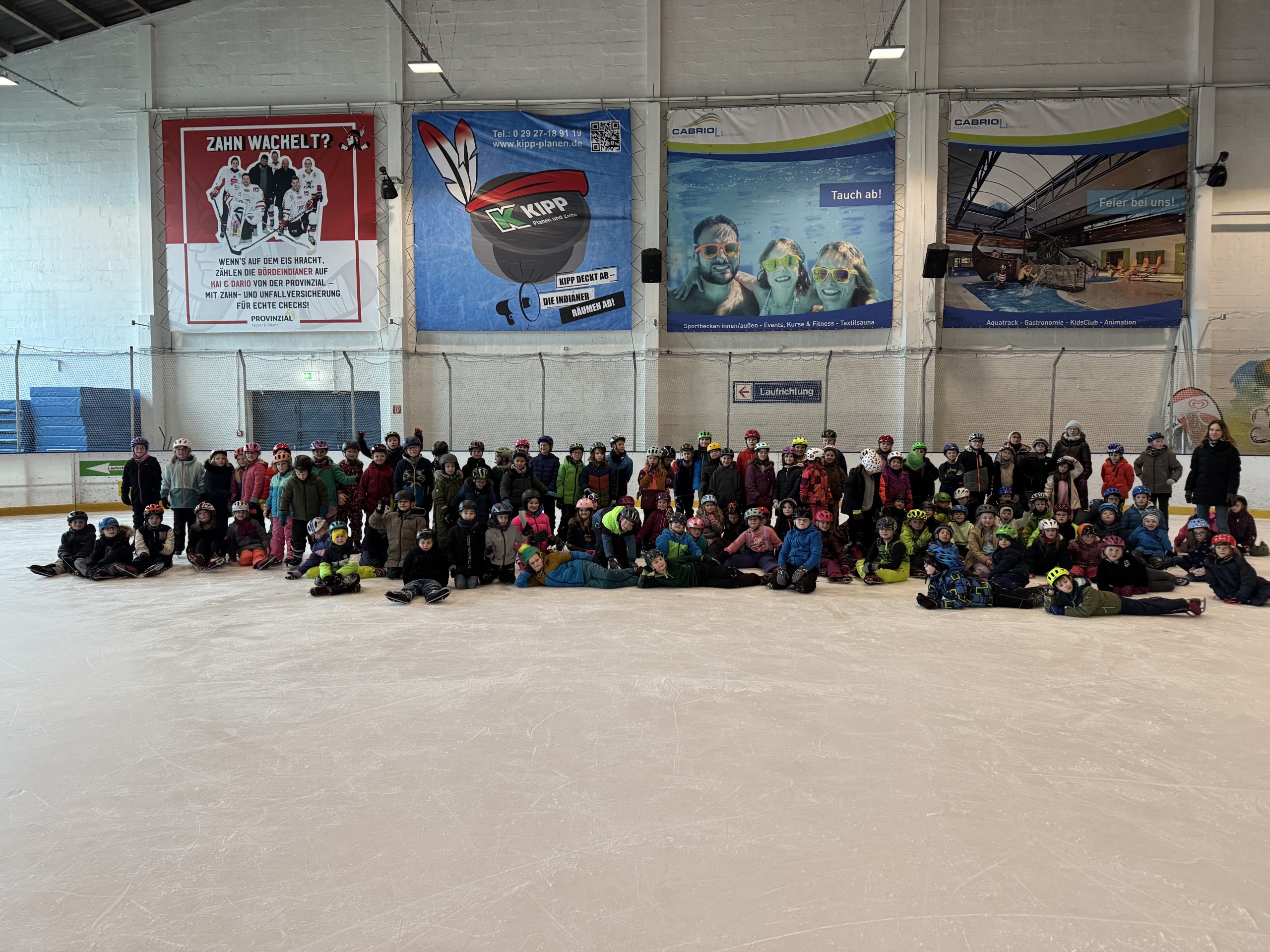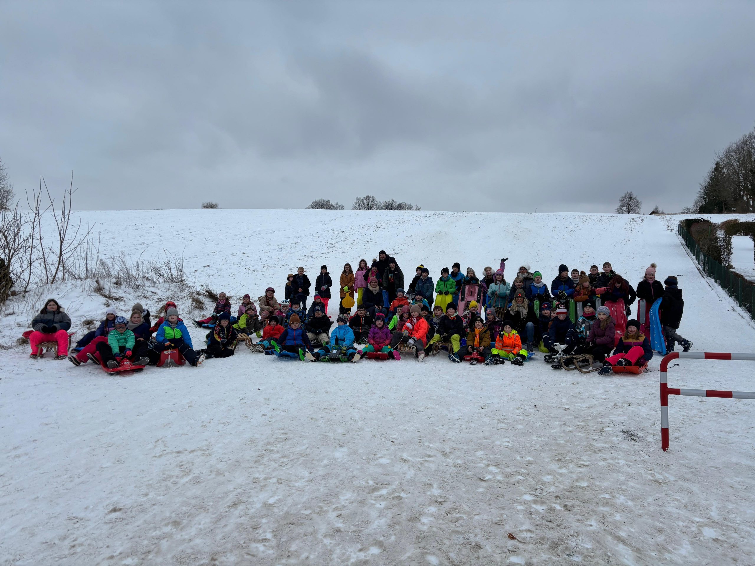 …eine Schlittenfahrt, die macht Spaß! Am Dienstag, den 08.01.2026 liefen die Klassen 3 und 4 der Johannesschule nach längerer, wetterbedingter Pause endlich mal wieder mit ihren Schlitten zum Grünen Weg. Es war, wie immer, ein Hochgenuss das Juchzen der Kinder zu hören und das Strahlen in den Augen vor Freude zu sehen, wenn man so viel Schwung genommen hatte und vom Berg über die schneeverwehte (verkehrsberuhigte) Straße zum nächsten Berg kam und das volle Rodelprogramm an dieser beliebten Allagener Stelle mitnehmen konnte. Wer aufmerksam zuschaute, der konnte ggfs. auch einen Lehrer 🙂 auf einem Schlitten erkennen, der jauchzend durch den Schnee wirbelte…Das war definitiv eine Mordsgaudi, die selbstredend zur Wiederholung freigegeben ist! Natürlich durfte am Ende das obligatorische Foto der Teilnehmer nicht fehlen.